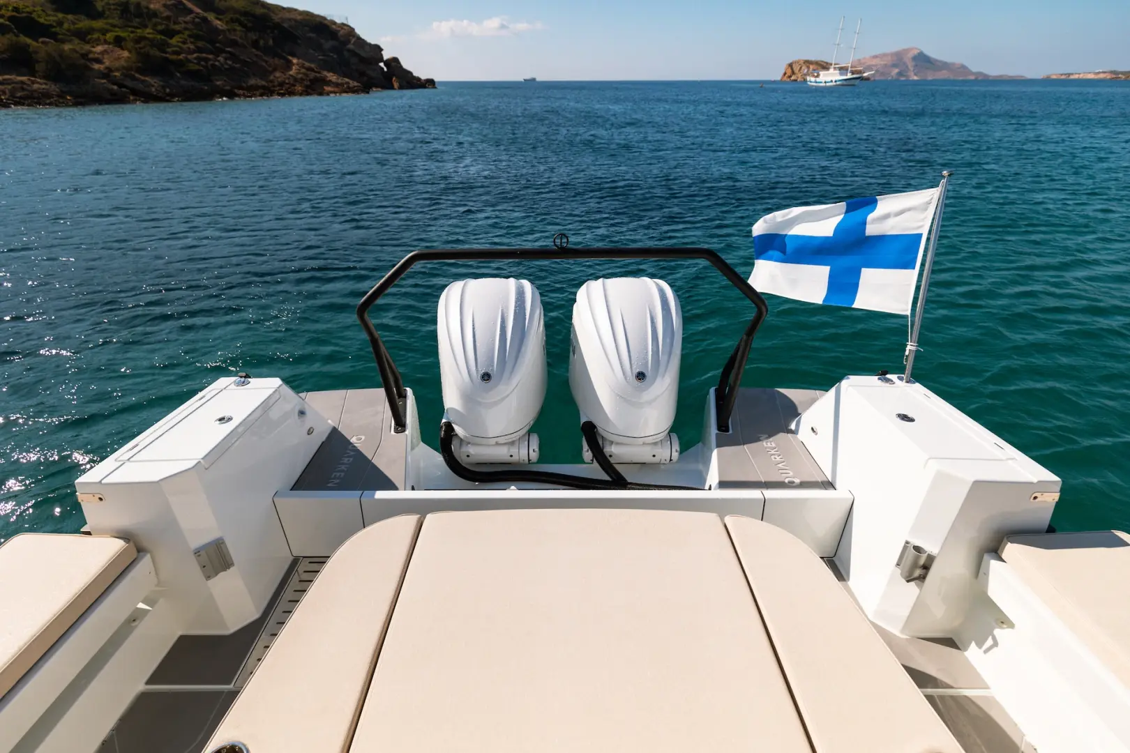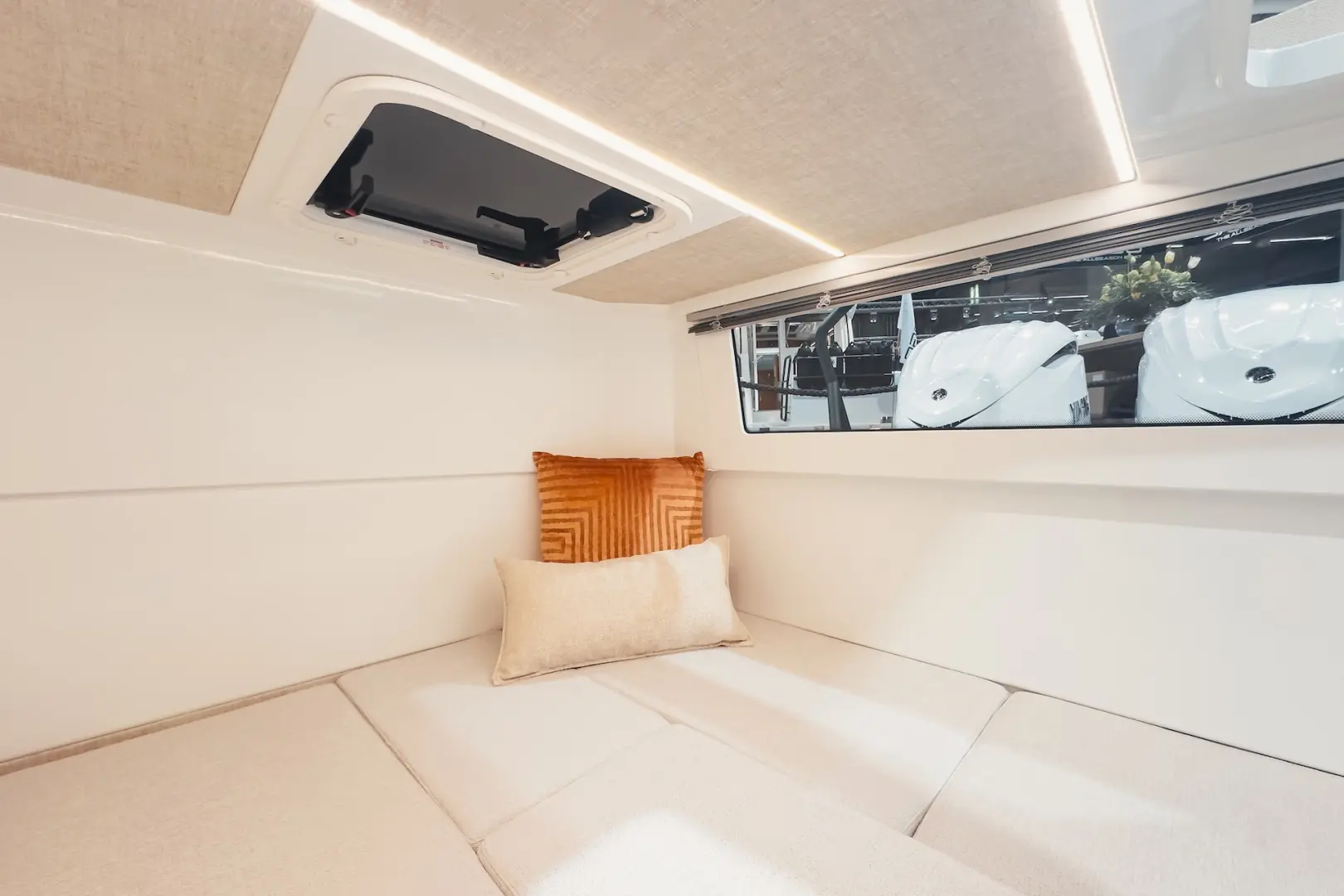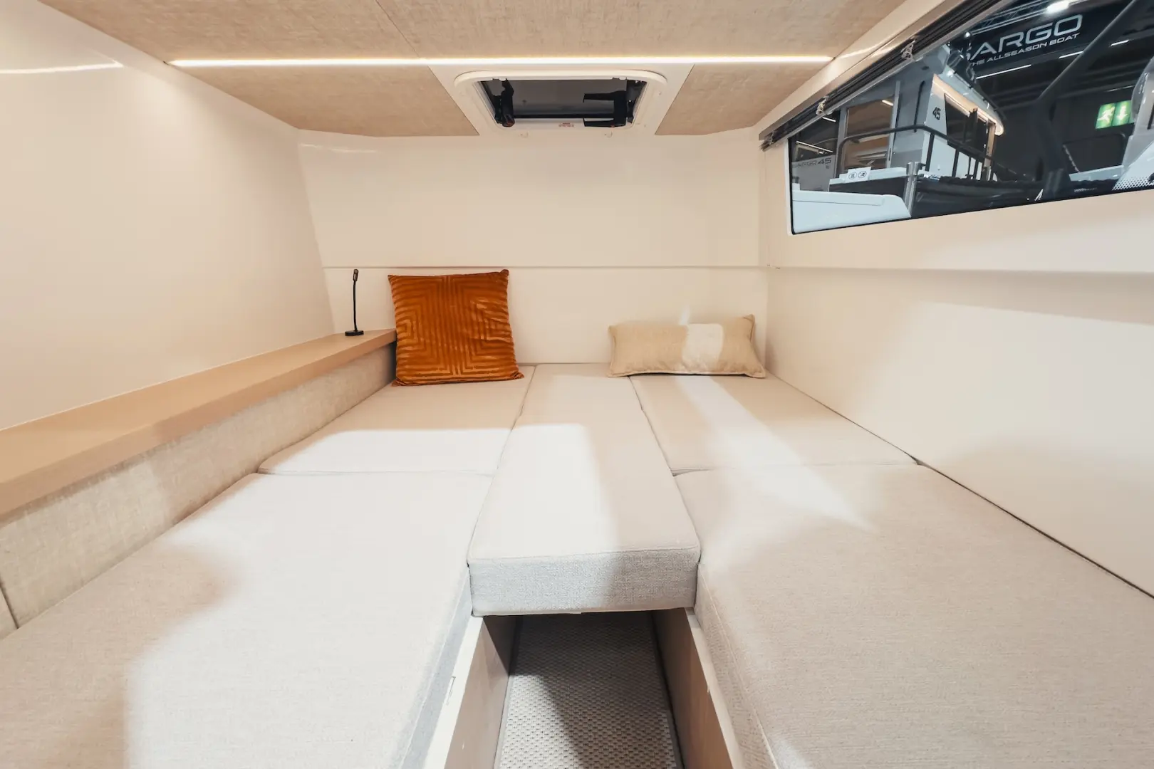 Negatif ön cam tasarımı yansımayı azaltarak özellikle zorlu hava koşullarında görüş kalitesini artırır. Güçlü tavan yapısı, açılır yan platformlar, geniş oturma grupları ve merkezi wet bar ünitesi; Q35 GT’yi hem seyir sırasında hem de demirde sosyal yaşam açısından son derece işlevsel hale getirir. Ön kamaradaki çift kişilik yatak, çocuk yatağına dönüşebilen sofa ve kapalı tuvalet bölümü ise konfor seviyesini tamamlar.
