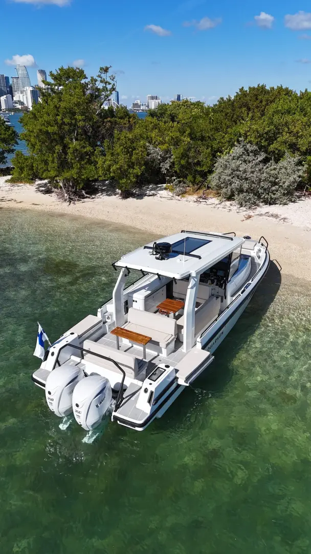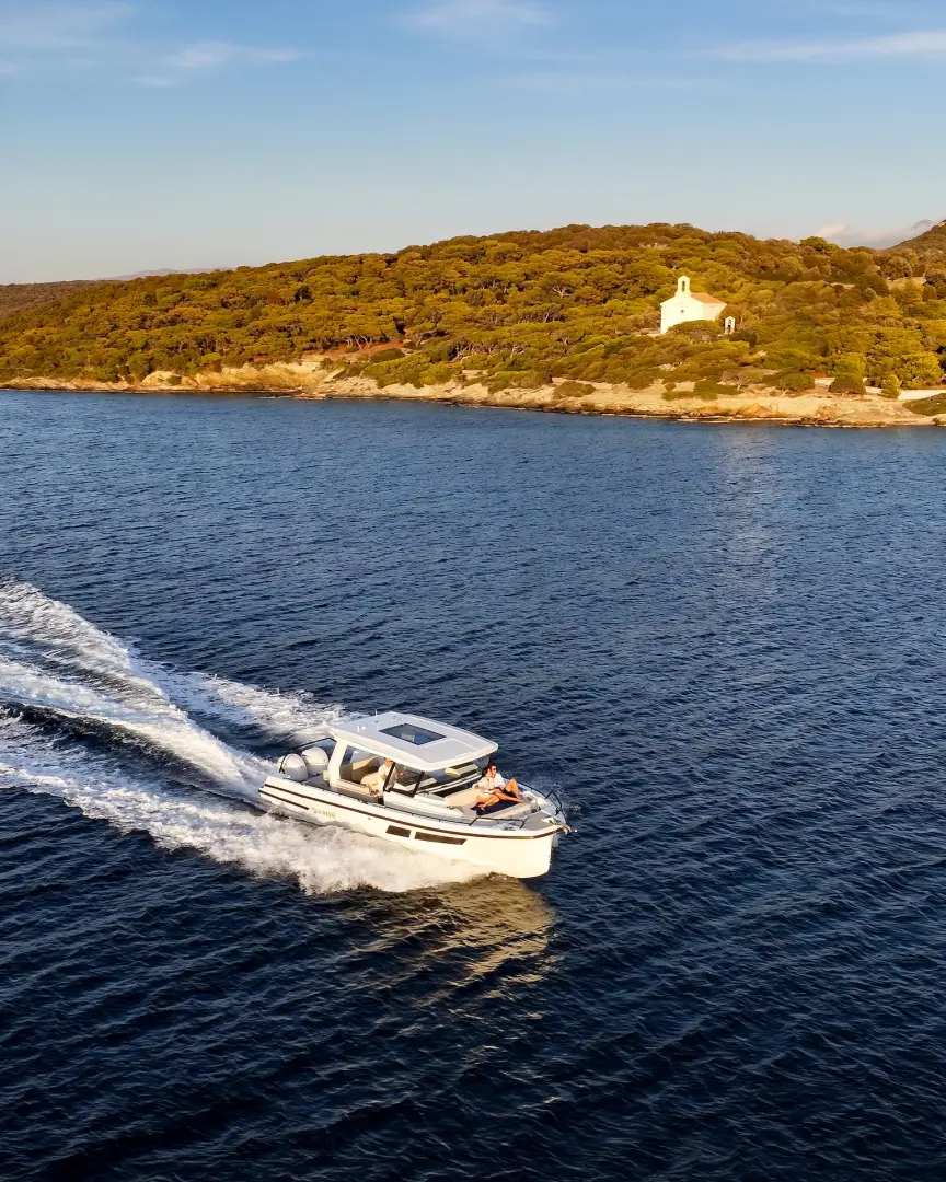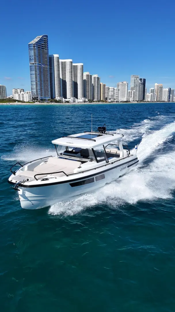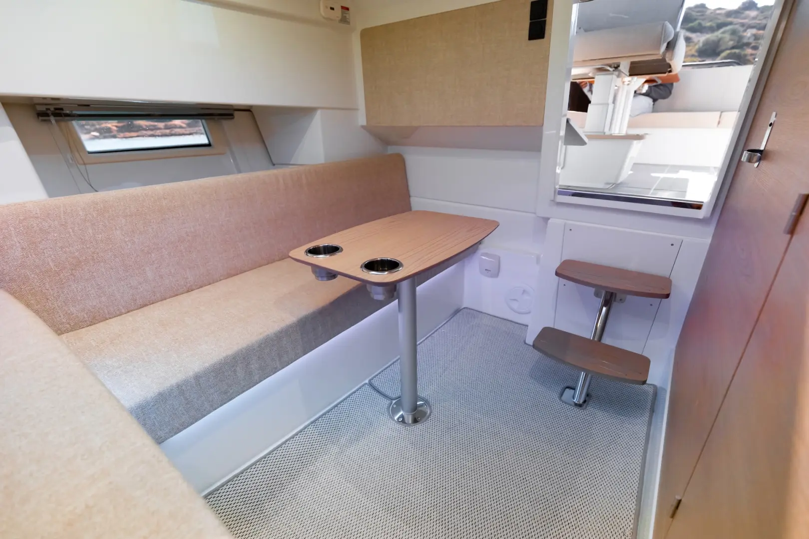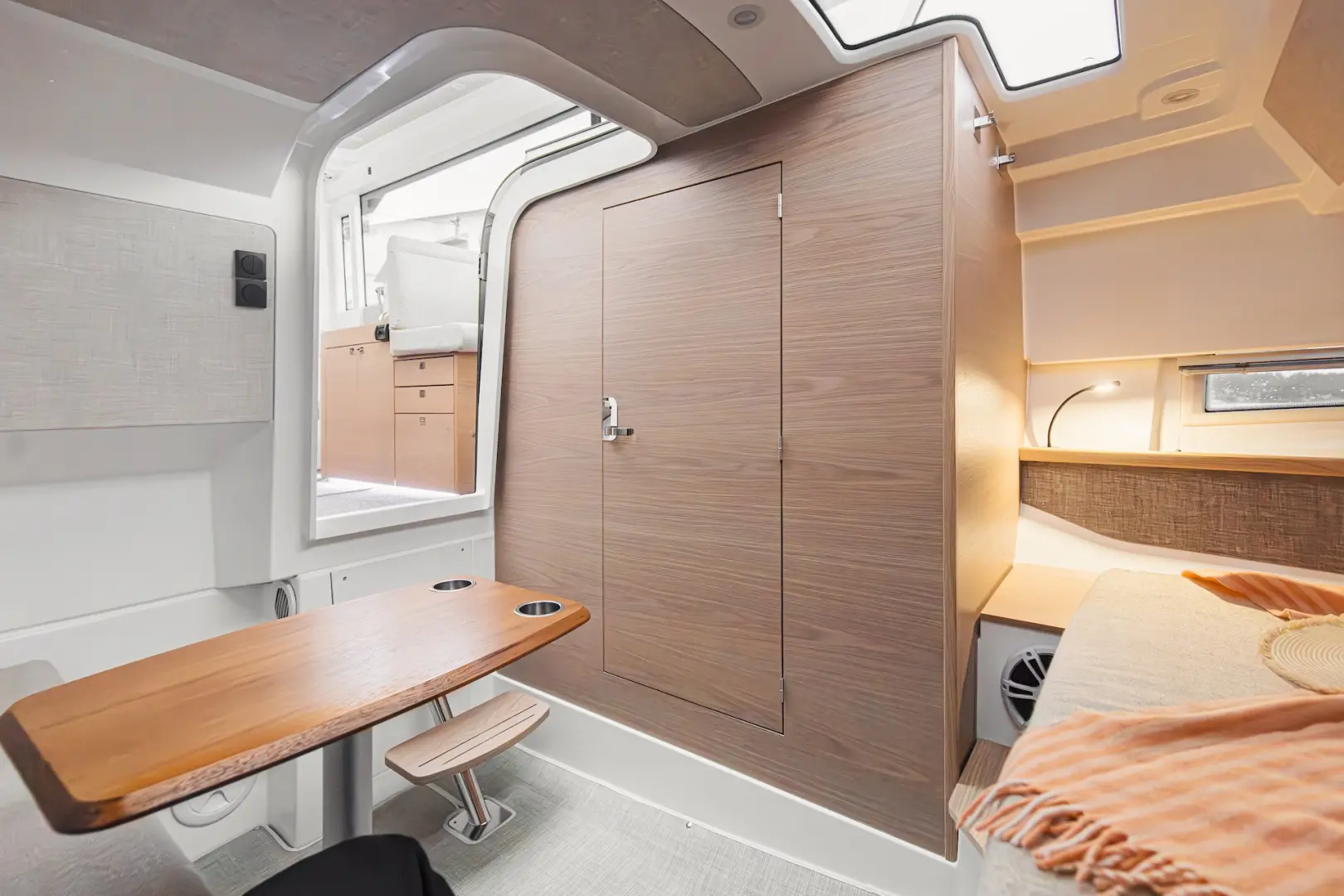 Negatif ön cam tasarımı yansımayı azaltarak özellikle zorlu hava koşullarında görüş kalitesini artırır. Güçlü tavan yapısı, açılır yan platformlar, geniş oturma grupları ve merkezi wet bar ünitesi; Q35 GT’yi hem seyir sırasında hem de demirde sosyal yaşam açısından son derece işlevsel hale getirir. Ön kamaradaki çift kişilik yatak, çocuk yatağına dönüşebilen sofa ve kapalı tuvalet bölümü ise konfor seviyesini tamamlar.